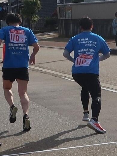 と背中にプリントの入った青色Tシャツを着用し、『110』のゼッケンを付けて、懸命にタスキを繋ぎました。